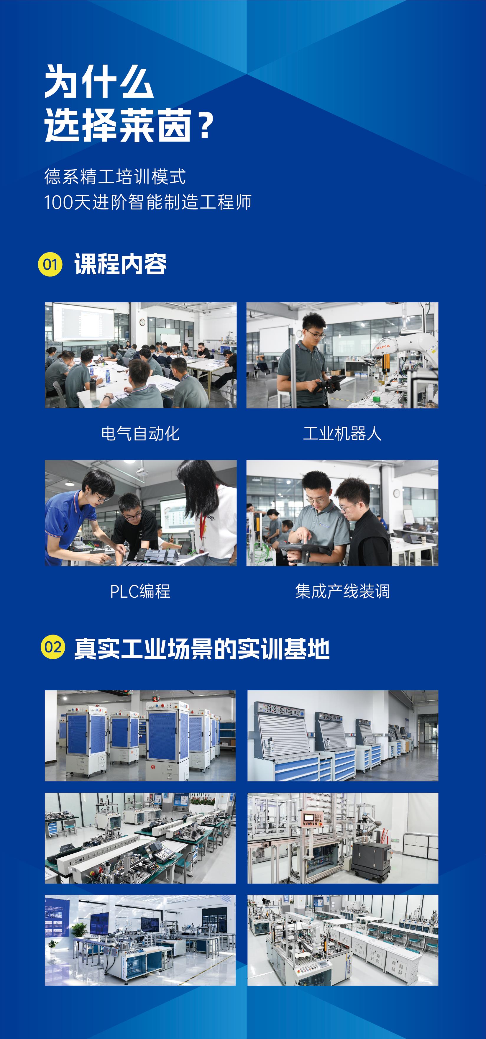 2、课程介绍:主要是针对高端制造型企业,培养技术人才,课程的培养方向分:机械、电气自动化、工业机器人、数字仿真。课程内容包含:机械原理,简单的零部件加工,机械装配,电工基础,电气安装,绘图,plc编程,步进,伺服,变频,HMI,工业机器人调试,工业机器视觉,智能产线运维,装配,调试,排障等