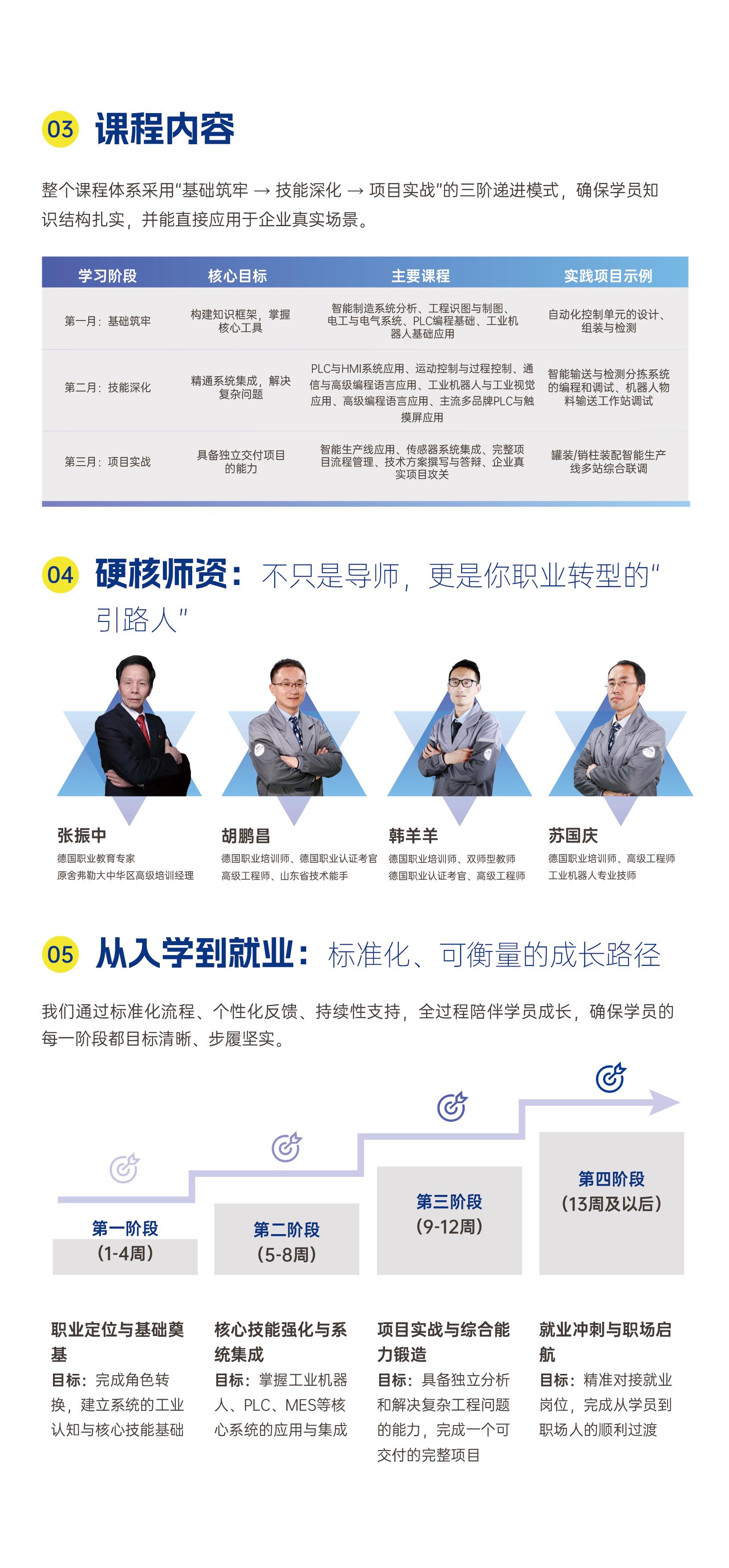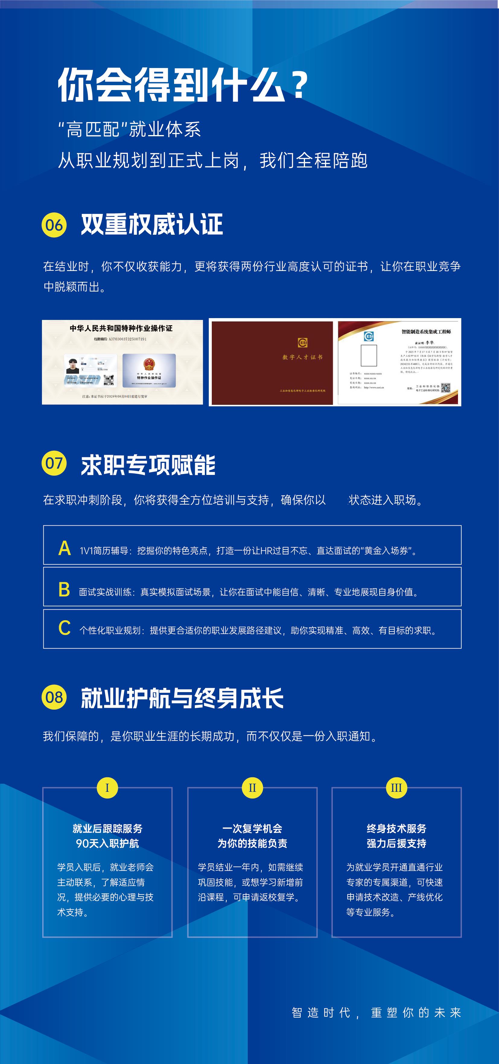 4、培训保障:①毕业颁发两个证书:低压电工证(行业的必备证书)、智能制造系统集成工程师证书(国家标准,工信部颁发,智能制造行业公认证书)②1V1简历定制化、职业素养课程(硬技能+软技能)、面试实战化训练(真实模拟企业面试,培训面试技巧,以及面试注意事项等)③终身技术指导(学员到企业有技术壁垒,或技术难题,免费回来咨询请教)、免费复学(若学员毕业未能达到毕业要求,或者是企业应聘要求,免费复学一期)