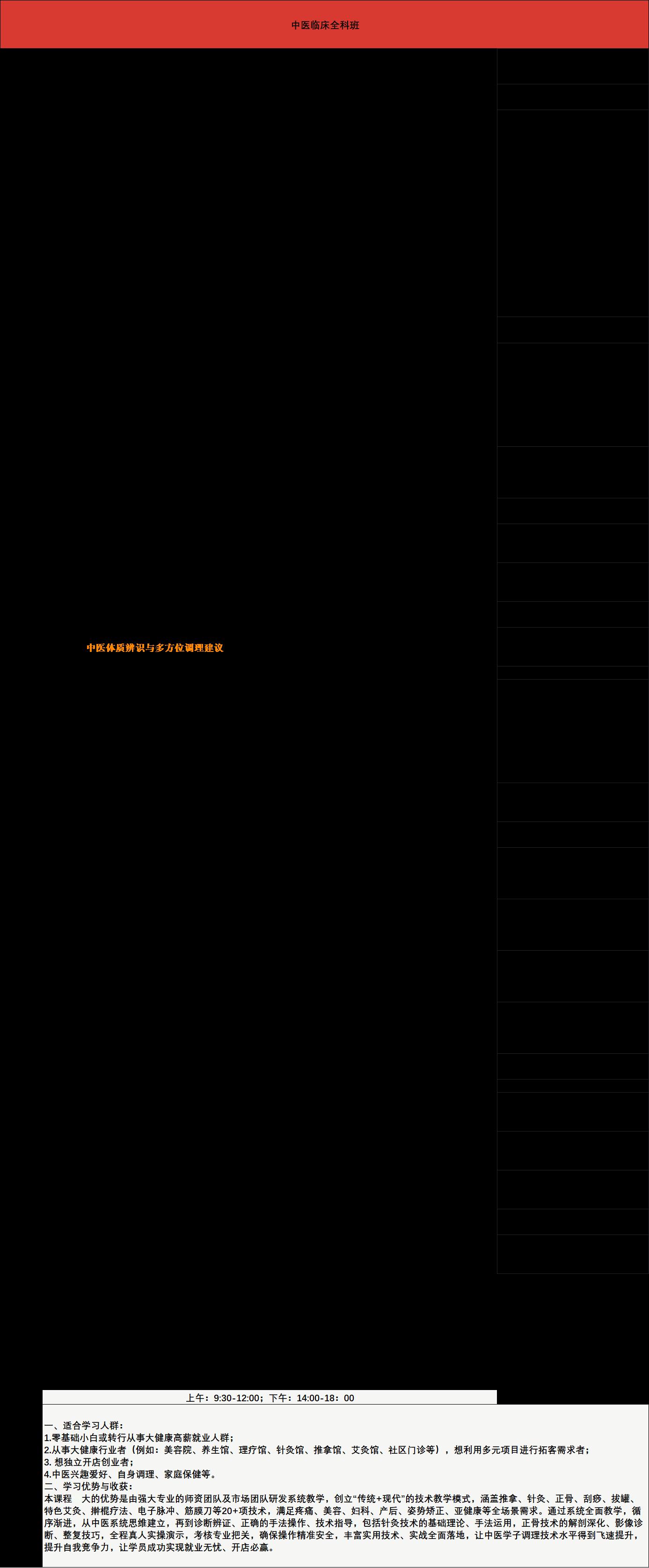 课程亮点:本课程大的优势是由强大专业的师资团队及市场团队研发系统教学, 创立“传统+现代”的技术教学模式,通过系统全面教学,循序渐进, 全程真人实操演示,考核专业把关,确保操作精准安全,丰富实用技 术、实战全面落地,让中医学子调理技术水平得到飞速提升,提升自 我竞争力,让学员成功实现就业无忧、开店必赢。