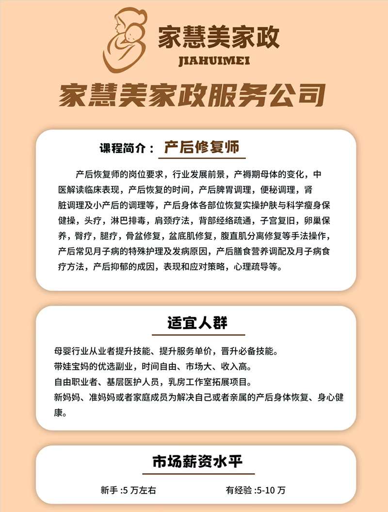 产后恢复师的岗位要求,行业发展前景,产褥期母体的变化,中医解读临床表现,产后恢复的时间,产后脾胃调理,便秘调理,肾胜调理及小产后的调理等,产后身体各部位恢复实操护肤与科学瘦身保健操,头疗,淋巴排毒,肩颈疗法,背部经络疏通,子宫复旧,卵巢保养,臀疗,腿疗,骨盆修复,盆底肌修复,腹直肌分离修复等手法操作,产后常见月子病的特殊护理及发病原因,产后膳食营养调配及月子病食疗方法,产后抑郁的成因,表现和应对策略,心理疏导等。