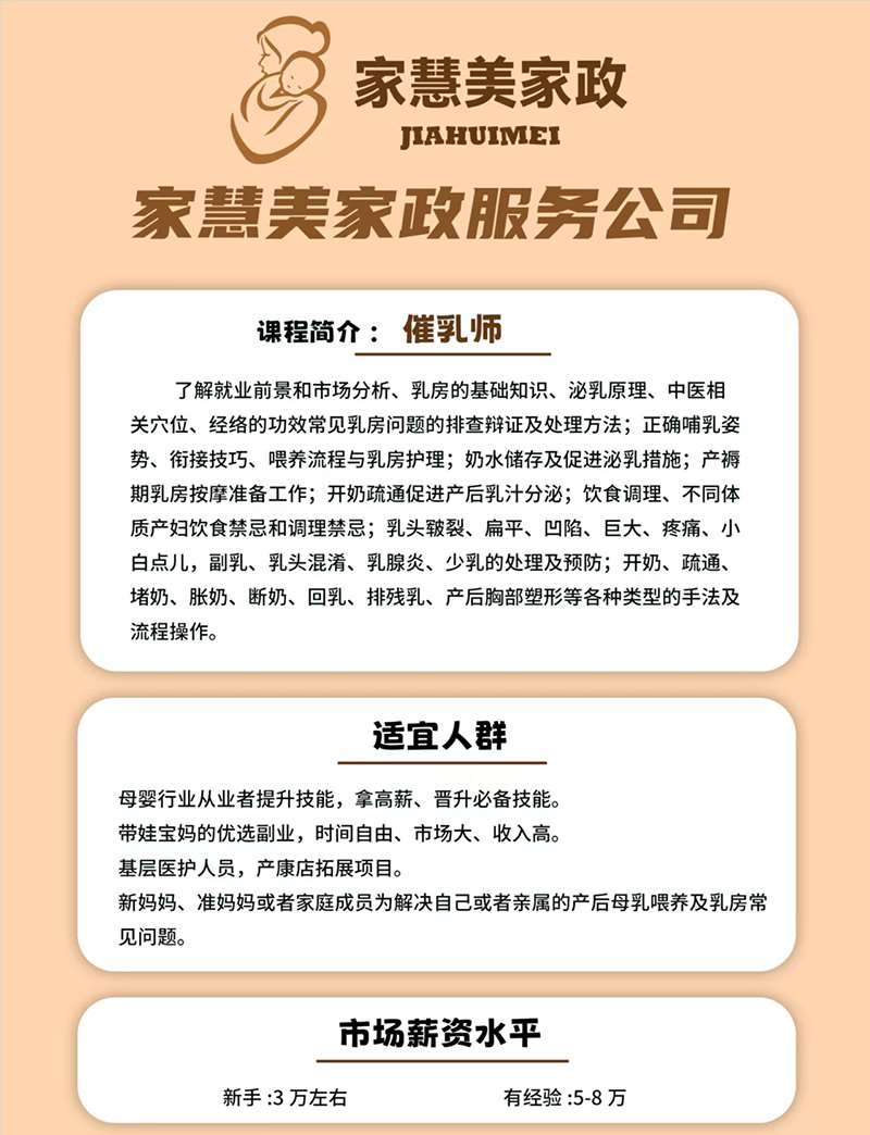 了解就业前景和市场分析、乳房的基础知识、泌乳原理、中医相关穴位、经络的功效常见乳房问题的排查辩证及处理方法;正确哺乳姿势、衔接技巧、喂养流程与乳房护理;奶水储存及促进泌乳措施;产期乳房按摩准备工作;开奶疏通促进产后乳汁分泌;饮食调理、不同体质产妇饮食禁忌和调理禁忌;乳头皲裂、扁平、凹陷、巨大、疼痛、小白点儿,副乳、乳头混淆、乳腺炎、少乳的处理及预防;开奶、疏通、堵奶、胀奶、断奶、回乳、排残乳、产后胸部塑形等各种类型的手法及流程操作。
