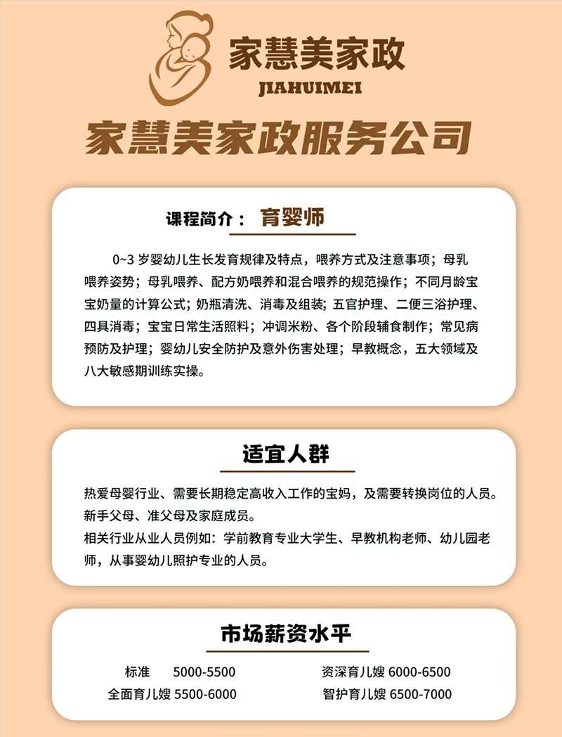 0~3 岁婴幼儿生长发育规律及特点,喂养方式及注意事项;母乳喂养姿势;母乳喂养、配方奶喂养和混合喂养的规范操作;不同月龄宝宝奶量的计算公式;奶瓶清洗、消毒及组装;五官护理、二便三浴护理、四具消毒;宝宝日常生活照料;冲调米粉、各个阶段辅食制作;常见病预防及护理;婴幼儿安全防护及意外伤害处理;早教概念,五大领域及八大敏感期训练实操。