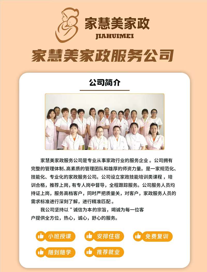家慧美家政服务公司是专业从事家政行业的服务企业。公司拥有完整的管理体制、高素质的管理团队和雄厚的师资力量。是一家规范化、技能化、专业化的家政服务公司。公司设立家政技能培训类课程,培训合格,推荐上岗,有专人岗中督导,全程跟踪服务。公司服务人员均持证上岗,服务高档客户,同时严把质量关,对客户,家政服务人员的需求标准进行深刻了解,进行精准匹配。我公司坚持以“诚信为本的宗旨,竭诚为每一位客户提供全方位,热心,诚心,舒心的服务。