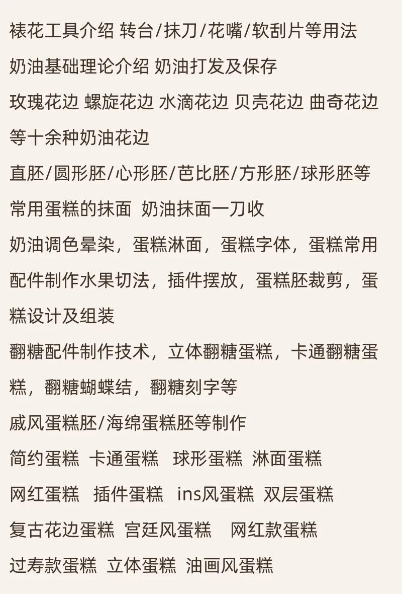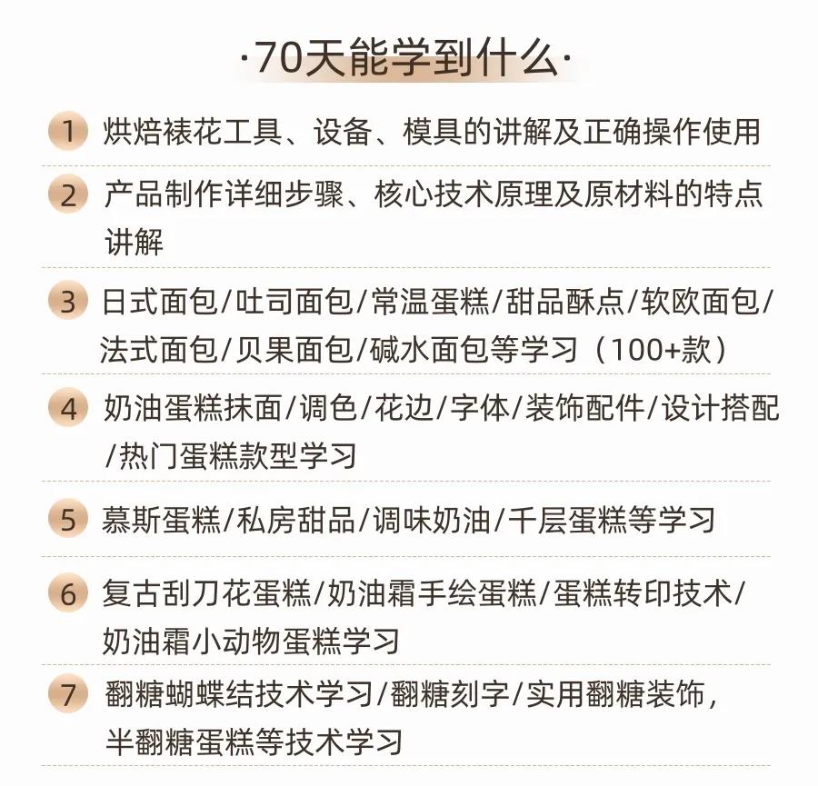 * 教学内容:课程覆盖流行蛋糕、韩式裱花、网红甜品、健康欧包等全品类。