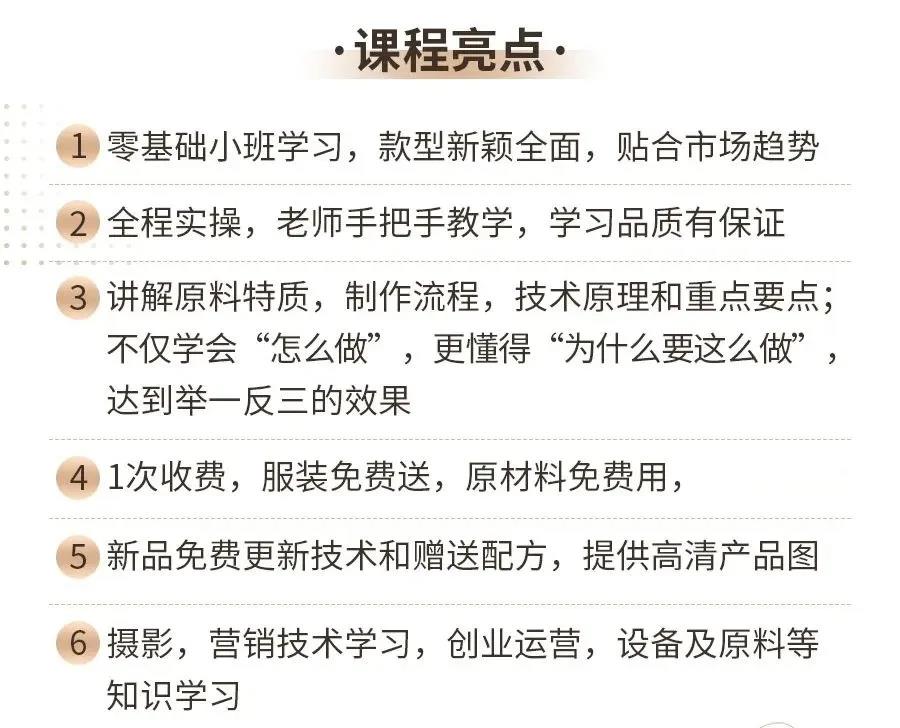 * 免费复训:学员享有免费复训权益,并可免费更新新品技术与配方。
