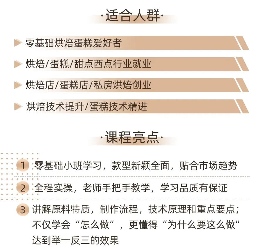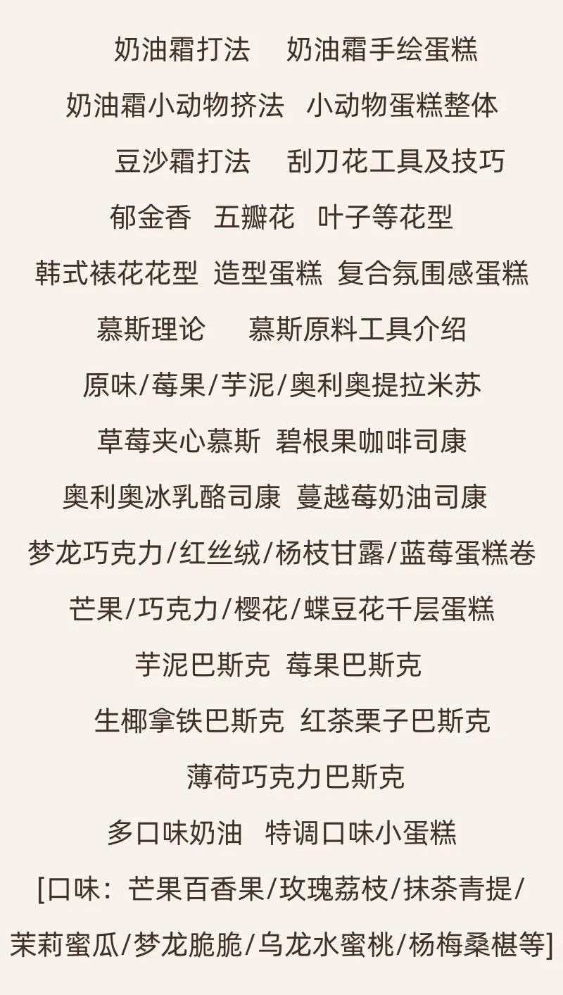 * 教学内容:课程覆盖流行蛋糕、韩式裱花、网红甜品、健康欧包等全品类。