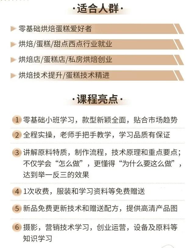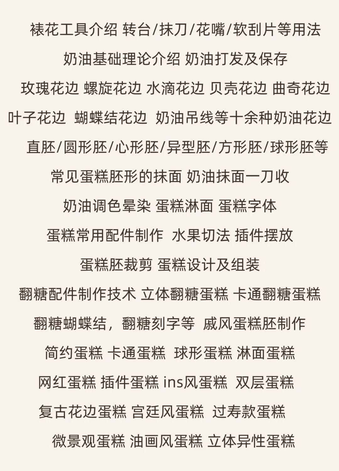 * 教学内容:课程覆盖流行蛋糕、韩式裱花、网红甜品、健康欧包等全品类。