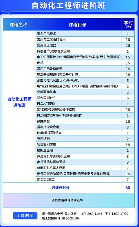 自动化工程师进阶班主要学习内容:常用低压电器(原理/读图/选型/接线);识读PLC程序;编写常规PLC程序;故障排查;中等控制柜配盘;ABB机器人基本操作; 综合实训(一);综合实训(二)
