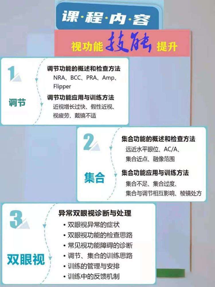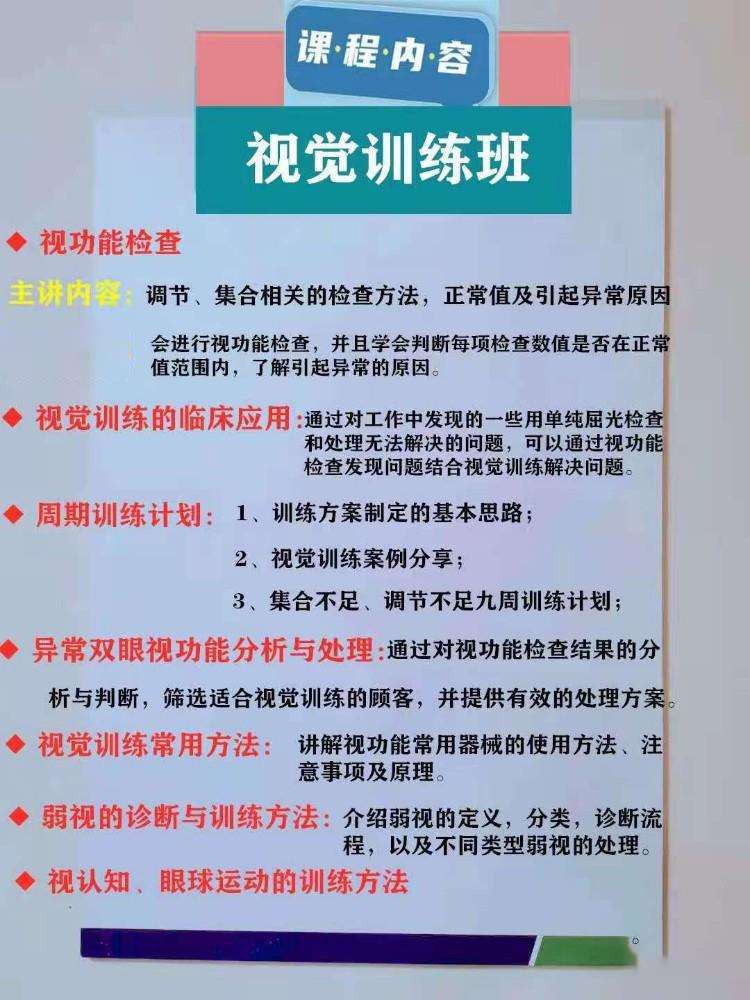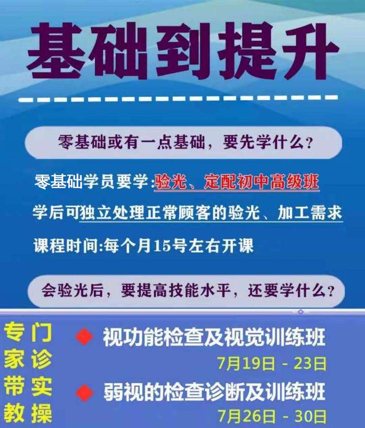 课程方向:眼镜基础部分,模拟验光部分,加工镜片实操部分,串讲+考核